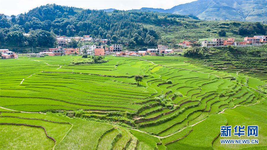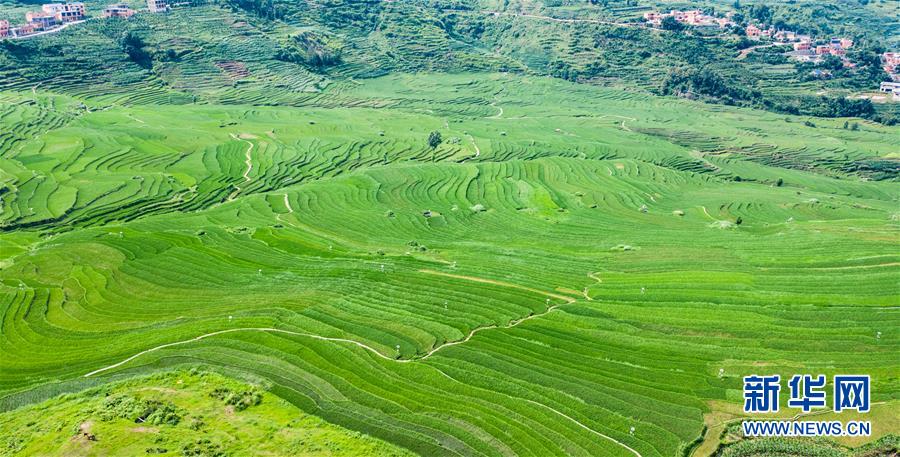 貴州省盤州市新民鎮(zhèn)的梯田風(fēng)光(6月29日攝,無(wú)人機(jī)照片)。夏日時(shí)節(jié),貴州省盤州市新民鎮(zhèn)的梯田風(fēng)景如畫。新華社記者陶亮攝