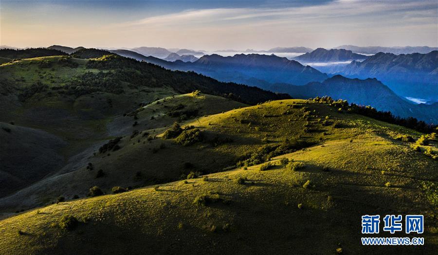 6月30日,朝霞照耀下的神田草甸(無人機照片)。位于陜西省安康市嵐皋縣與重慶市城口縣交界處大巴山神田主脊北坡的神田草甸,面積超過1.1萬畝。夏日的朝霞中,起伏的草甸仿佛一塊寬大無邊的綠色地毯,鑲嵌在大巴山上,如詩如畫。新華社記者陶明攝