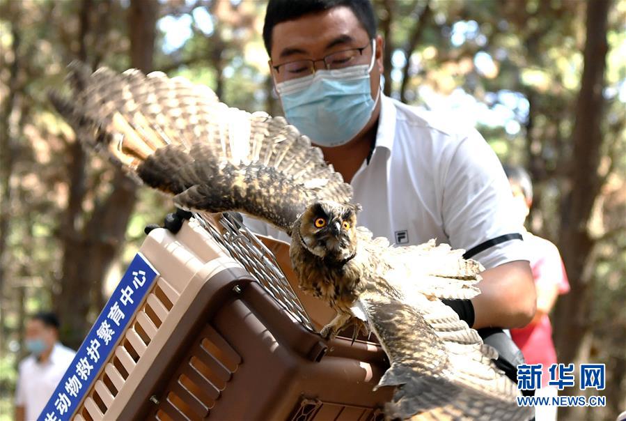 7月1日,吉林省野生動(dòng)物救護(hù)繁育中心工作人員放飛一只長(zhǎng)耳鸮。當(dāng)日,吉林省東北虎園舉行放飛活動(dòng),吉林省野生動(dòng)物救護(hù)繁育中心救護(hù)的40只珍稀野生鳥類成功放歸自然。新華社記者林宏攝