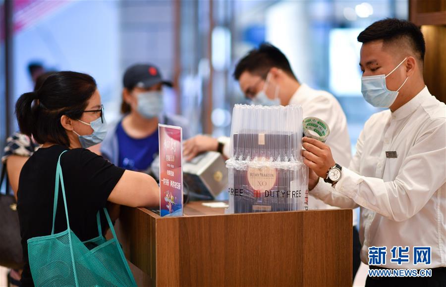 7月1日,海口日月廣場(chǎng)免稅店的工作人員為顧客打包酒類商品。當(dāng)日,海南開始實(shí)施調(diào)整后的離島免稅購物政策。海南離島旅客每年每人免稅購物額度提高至10萬元,電子消費(fèi)產(chǎn)品等7類新增商品開售。新華社記者郭程攝