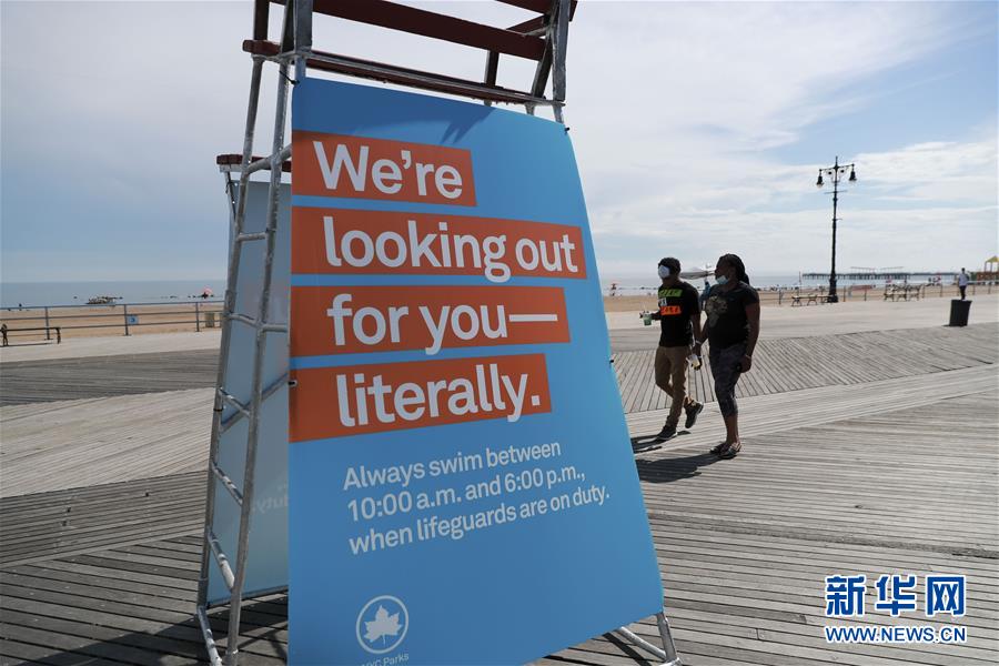 這是7月1日在美國紐約科尼島一處海灘上拍攝的關(guān)于允許游泳時(shí)間的提示牌。當(dāng)日,美國紐約市屬八處海灘正式重新準(zhǔn)許民眾游泳,救生員也同時(shí)上崗。新華社記者王迎攝