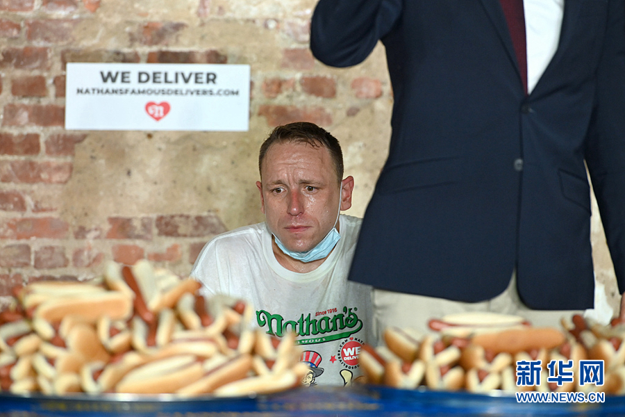 7月4日,美國紐約布魯克林舉行一年一度的國際吃熱狗比賽,喬伊·切斯納特以吃75個熱狗的成績贏得男子賽區(qū)冠軍,創(chuàng)下了新的世界紀錄。(圖片來源:視覺中國)
