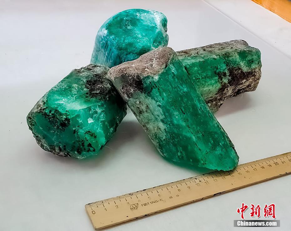 當?shù)貢r間7月7日,俄羅斯斯維爾德洛夫斯克州,俄羅斯國家技術(shù)集團在馬林斯克礦區(qū)內(nèi)發(fā)現(xiàn)總重量達4.8公斤的4塊綠寶石,是最近20年來發(fā)現(xiàn)的同類品質(zhì)中最大的寶石。圖片來源:視覺中國