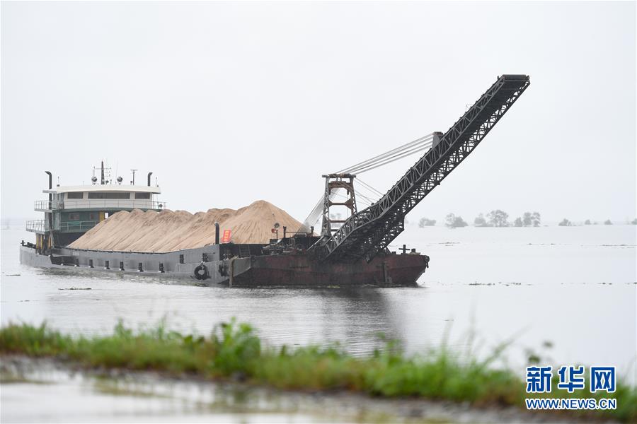 在益陽市大通湖區(qū)東大堤附近水域,一艘船采取“以船代倉(cāng)”方式儲(chǔ)備防汛物資(7月8日攝)。新華社記者陳澤國(guó)攝