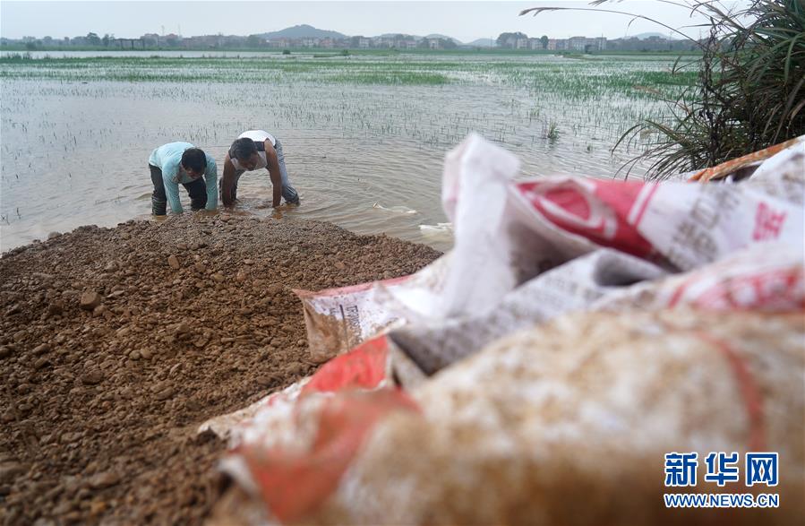 7月9日,邵忠如(前左二)和村民們裝填沙袋,封堵圩堤上的泡泉。新華社記者萬(wàn)象攝