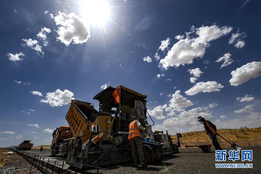 7月10日,工人在位于寧夏境內的烏瑪高速青銅峽至中衛(wèi)段A10標段施工。盛夏時節(jié),位于寧夏境內的烏瑪(內蒙古烏海市至青?,斍呖h)高速青銅峽至中衛(wèi)段正在抓緊施工建設。該路段主線全長122.9公里,其中穿越騰格里沙漠腹地的18公里公路是寧夏建設的首條沙漠高速公路,預計2021年建成通車。新華社記者馮開華攝。