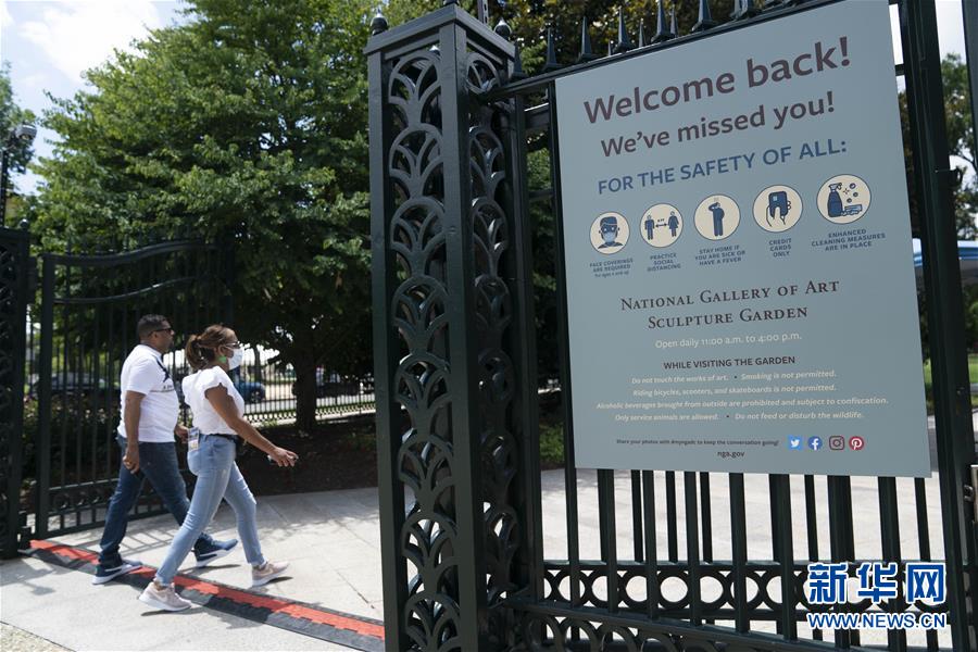 7月11日,人們?cè)诿绹?guó)華盛頓國(guó)家藝術(shù)畫(huà)廊雕塑公園游覽時(shí)經(jīng)過(guò)門(mén)口關(guān)于疫情防控的告示。新華社記者劉杰攝