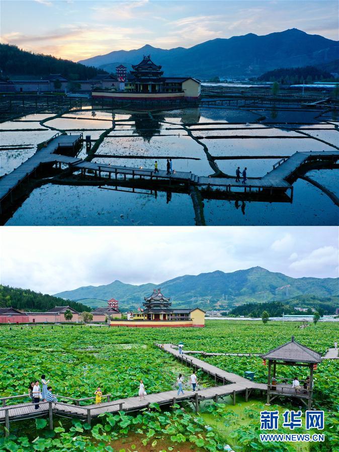 拼版照片:人們在浦源村鯉魚溪公園內(nèi)游覽(上圖為4月17日拍攝;下圖為7月3日拍攝)。新華社記者 姜克紅 攝