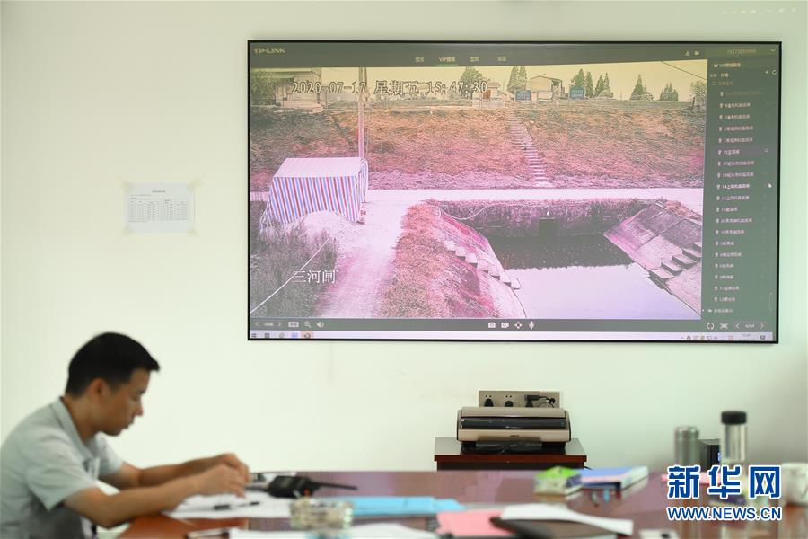 7月17日,在岳陽市華容縣治河渡鎮(zhèn)防汛抗旱指揮所,大屏實時顯示新華垸三門閘附近情況。為力爭安全度汛,湖南省岳陽市華容縣織密人防、物防、技防“三防”網(wǎng)絡(luò),加強應(yīng)急值守和巡查排險工作,采取“以船代倉”“以車代倉”等多種方式靈活儲備防汛物資,在險工險段布置攝像頭實時監(jiān)控,利用無人機對人員難以到達的位置進行巡查。新華社記者陳澤國攝