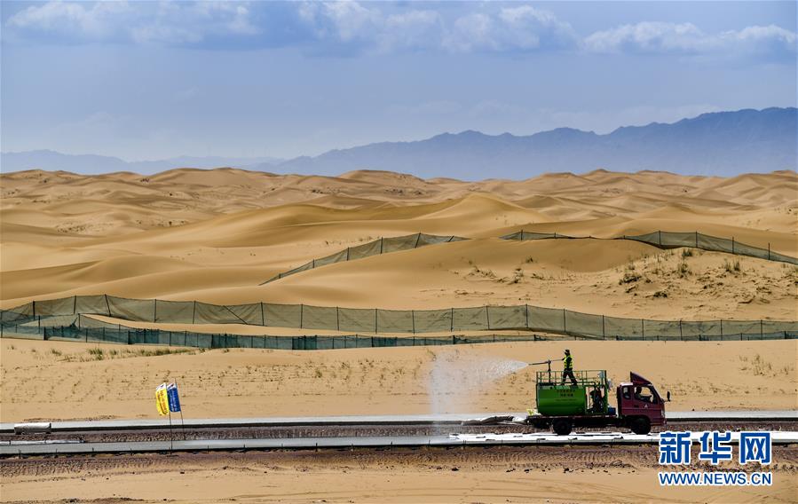 7月10日,工人在位于寧夏境內(nèi)的烏瑪高速青銅峽至中衛(wèi)段A9標(biāo)段施工。盛夏時節(jié),位于寧夏境內(nèi)的烏瑪(內(nèi)蒙古烏海市至青?,斍呖h)高速青銅峽至中衛(wèi)段正在抓緊施工建設(shè)。該路段主線全長122.9公里,其中穿越騰格里沙漠腹地的18公里公路是寧夏建設(shè)的首條沙漠高速公路,預(yù)計2021年建成通車。新華社記者馮開華攝