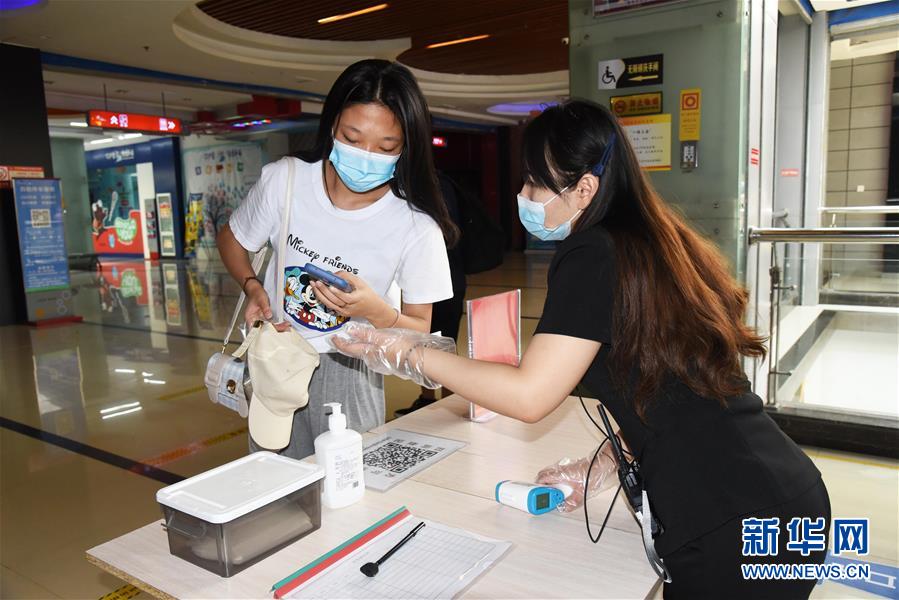 7月20日,濟(jì)南新世紀(jì)電影城陽(yáng)光100店的員工(右)在核對(duì)觀眾的健康碼。當(dāng)日,山東濟(jì)南市部分電影院在嚴(yán)格防控疫情的基礎(chǔ)上陸續(xù)恢復(fù)開(kāi)放。新華社記者王凱攝