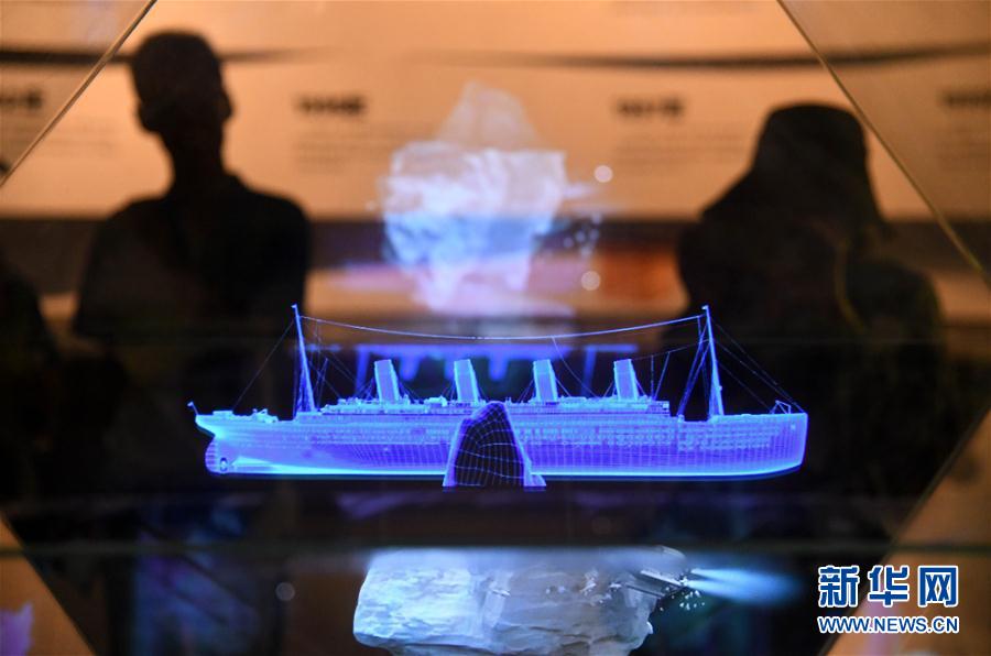 2019年8月28日,參觀者在電影博物館內(nèi)觀看“泰坦尼克號”數(shù)字模型全息演示。當(dāng)日,2019青島國際影視博覽會舉行青島電影博物館探館活動。新華社記者李紫恒攝