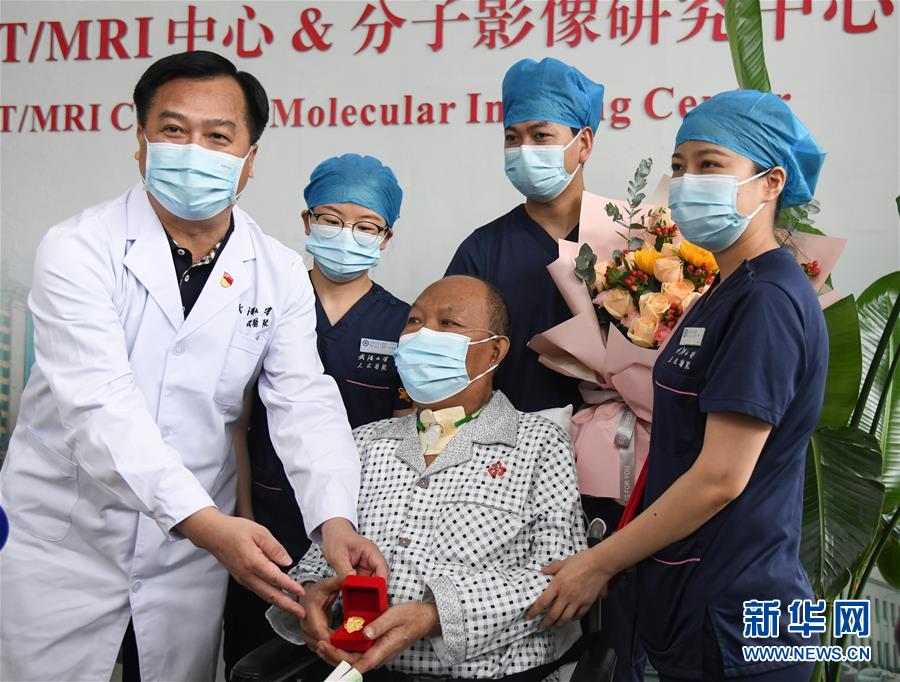 7月21日,武漢大學(xué)人民醫(yī)院黨委書記萬紅慧(左一)為崔先生贈送徽章。新華社記者程敏攝