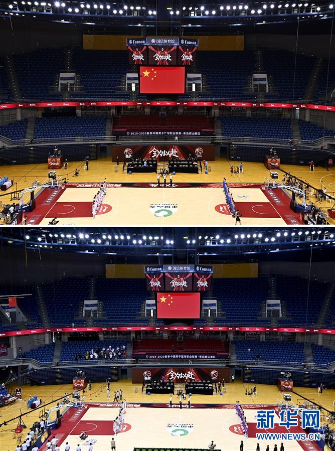 拼版照片的上圖為7月26日遼寧本鋼隊對陣四川五糧金樽隊的比賽現(xiàn)場;下圖為7月26日上海久事隊對陣山東西王隊的比賽現(xiàn)場,該場比賽首次恢復(fù)觀眾現(xiàn)場觀看比賽。當(dāng)日,在山東青島舉行的2019-2020賽季中國男子籃球職業(yè)聯(lián)賽(CBA)復(fù)賽第二階段(嶗山賽區(qū))比賽中,醫(yī)護(hù)人員、教師、公安戰(zhàn)線人士通過官方購票平臺,完成包括核酸檢測在內(nèi)的相關(guān)流程后進(jìn)場觀看了上海久事隊迎戰(zhàn)山東西王隊的比賽。觀賽期間,觀賽者須全程佩戴口罩,對號入座,嚴(yán)格保持間隔一米就座。退場時,觀眾須按照自后向前、先兩邊后中間的順序,保持“一米線”社交距離有序退場。新華社記者 郭緒雷 攝