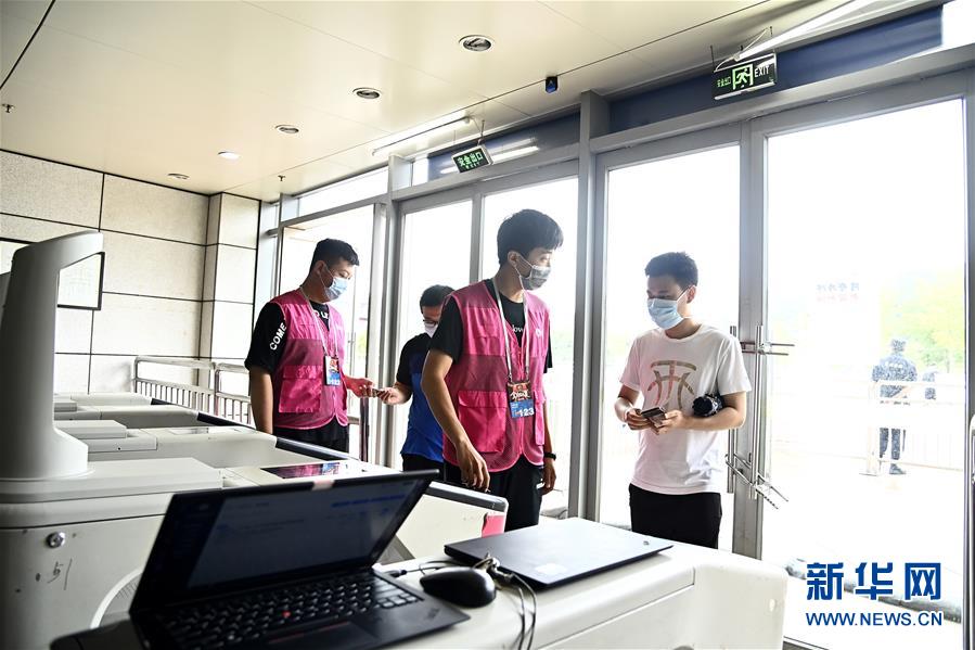 7月26日,在青島國信體育館,蘇柯帆(右)正在進(jìn)場。他成為CBA聯(lián)賽允許觀眾現(xiàn)場觀賽后,首位進(jìn)場的觀眾。當(dāng)日,在山東青島舉行的2019-2020賽季中國男子籃球職業(yè)聯(lián)賽(CBA)復(fù)賽第二階段(嶗山賽區(qū))比賽中,醫(yī)護(hù)人員、教師、公安戰(zhàn)線人士通過官方購票平臺,完成包括核酸檢測在內(nèi)的相關(guān)流程后進(jìn)場觀看了上海久事隊迎戰(zhàn)山東西王隊的比賽。觀賽期間,觀賽者須全程佩戴口罩,對號入座,嚴(yán)格保持間隔一米就座。退場時,觀眾須按照自后向前、先兩邊后中間的順序,保持“一米線”社交距離有序退場。新華社記者 郭緒雷 攝
