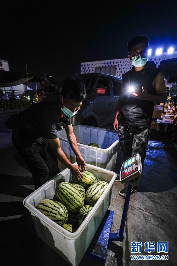 7月26日,在烏魯木齊新聯(lián)農(nóng)副產(chǎn)品綜合市場內(nèi),烏魯木齊市一小區(qū)志愿者(右)在幫助小區(qū)居民采購西瓜。新華社記者 趙戈 攝