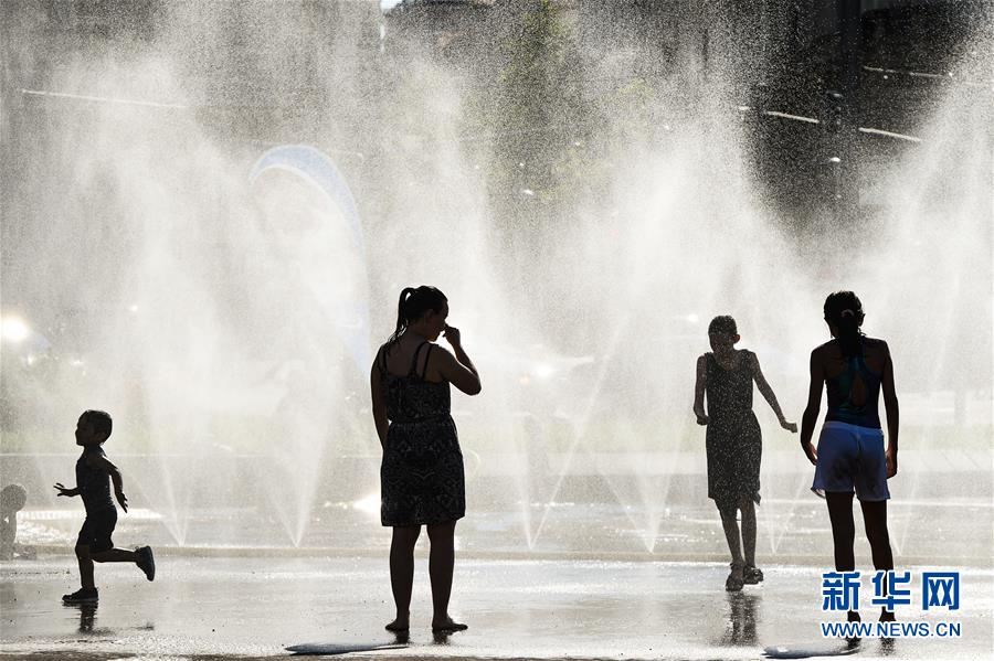 7月28日,在奧地利維也納,人們在一處廣場戲水。新華社記者郭晨攝