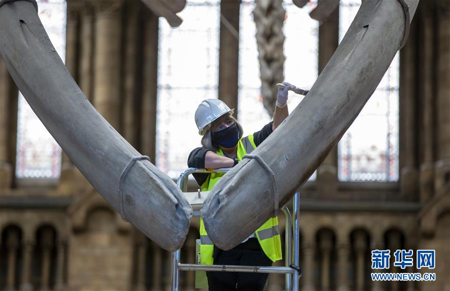 7月27日,一名工作人員在英國倫敦的自然歷史博物館大廳內(nèi)清潔一具藍鯨骨架。受新冠疫情影響關(guān)閉數(shù)月的英國自然歷史博物館將于8月5日重新對外開放,目前館方正在為重新開放做最后準備。參觀者需要提前預約參觀時段、全程佩戴口罩且保持安全距離。新華社記者韓巖攝