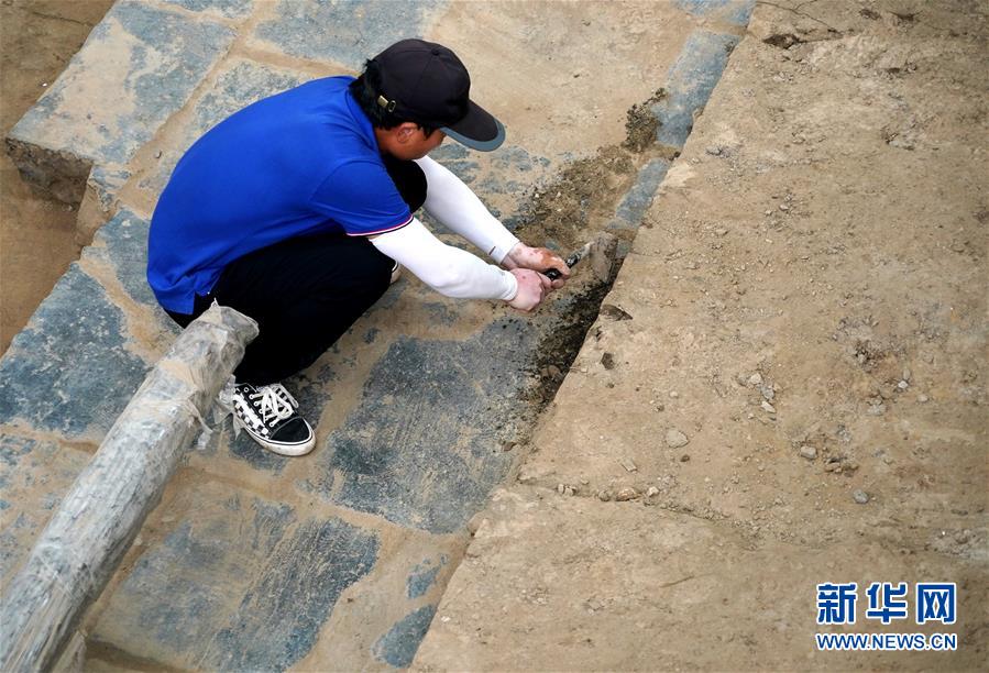 工作人員在河南省開(kāi)封市州橋橋面進(jìn)行清理發(fā)掘(7月27日攝)。新華社記者李安攝