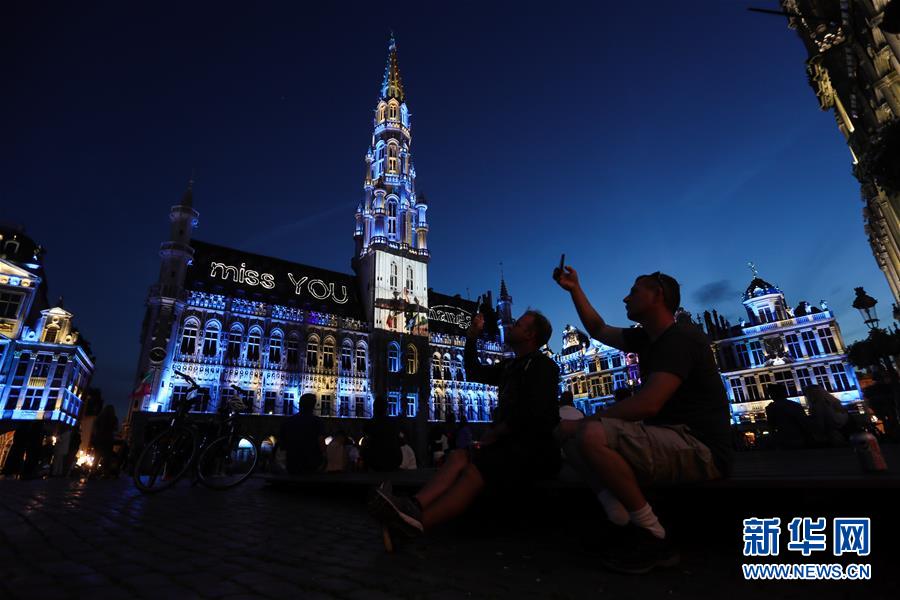 7月29日,人們?cè)诒壤麜r(shí)布魯塞爾大廣場(chǎng)欣賞聲光秀。7月29日,比利時(shí)布魯塞爾大廣場(chǎng)舉行大型聲光秀。藝術(shù)家在市政廳等歷史建筑上投影文字和圖案,紀(jì)念這個(gè)夏天受新冠疫情影響而不能如期舉辦的文化活動(dòng)。新華社記者鄭煥松攝