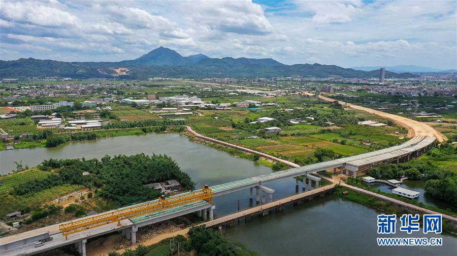 潮汕環(huán)線高速公路北溪河橋正在架梁(無(wú)人機(jī)照片,7月31日攝)。新華社記者劉大偉攝