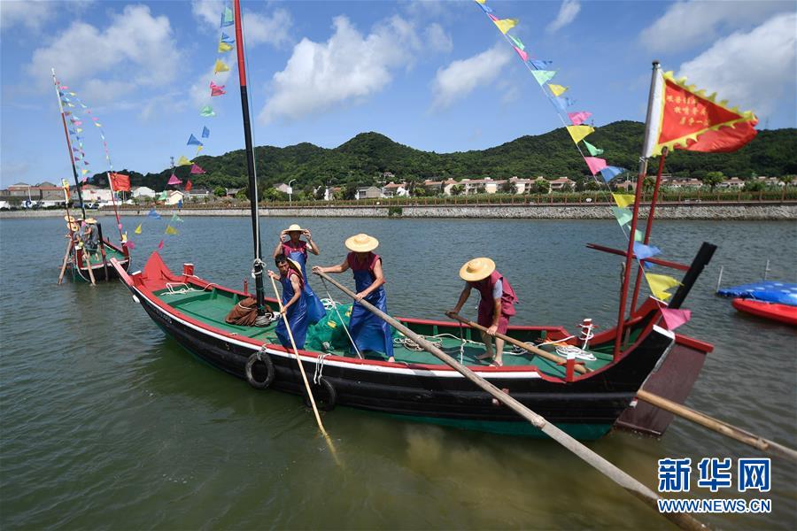 8月1日,螞蟻島居民在避風(fēng)塘漁民勞作現(xiàn)場(chǎng)體驗(yàn)區(qū)為游客表演木帆船捕魚。新華社記者黃宗治攝