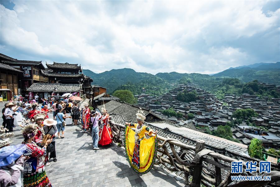 游客在貴州省雷山縣西江千戶苗寨景區(qū)內拍照留念(7月31日攝)。新華社記者陶亮攝