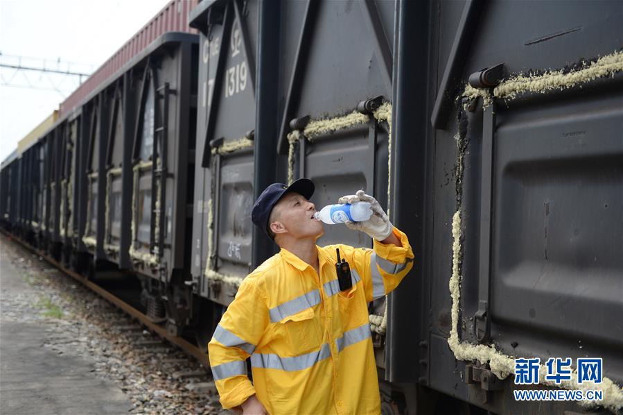 8月6日,合肥運(yùn)用車間列車檢修員在工作間隙喝水。合肥市近日持續(xù)高溫天氣。在中國鐵路上海局集團(tuán)有限公司杭州北車輛段合肥運(yùn)用車間,386名列車檢修工人頭頂烈日堅(jiān)守崗位,確保暑運(yùn)列車的安全運(yùn)行。據(jù)了解,暑運(yùn)期間,合肥運(yùn)用車間日均檢修列車105列,檢修車廂5058節(jié)。新華社記者黃博涵攝