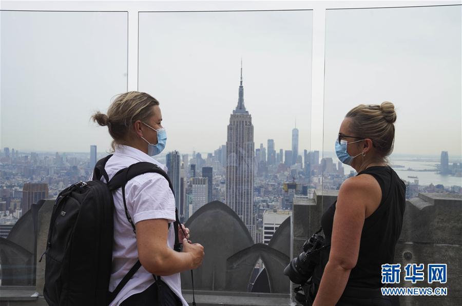 8月6日,在美國紐約,人們在洛克菲勒中心觀景臺(tái)上觀看城市景觀。當(dāng)日,3月份暫時(shí)關(guān)閉的洛克菲勒中心觀景臺(tái)恢復(fù)對(duì)公眾開放。每天13時(shí)至21時(shí),人們可戴口罩前往參觀。新華社記者王迎攝