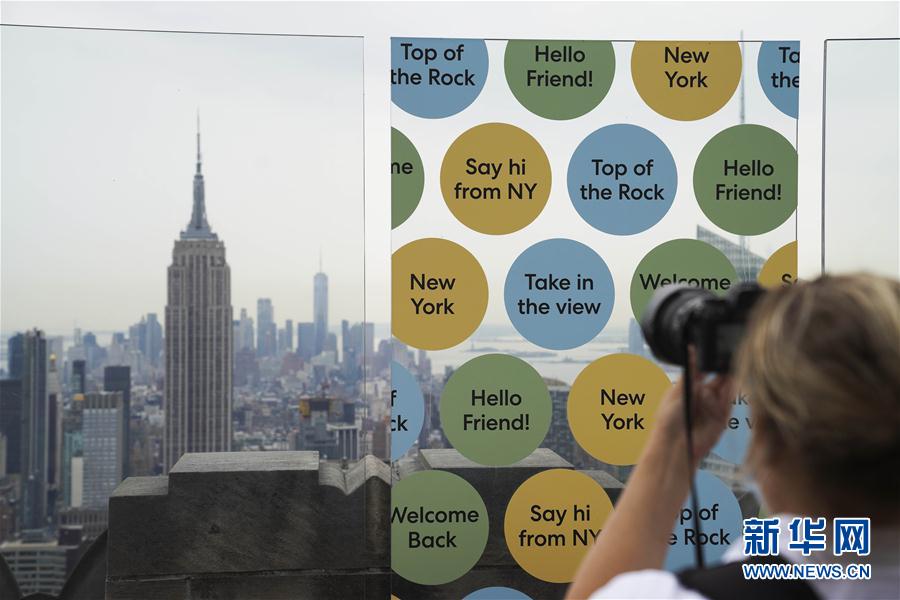 8月6日,在美國紐約,一名攝影師在洛克菲勒中心觀景臺(tái)上參觀。當(dāng)日,3月份暫時(shí)關(guān)閉的洛克菲勒中心觀景臺(tái)恢復(fù)對(duì)公眾開放。每天13時(shí)至21時(shí),人們可戴口罩前往參觀。新華社記者王迎攝