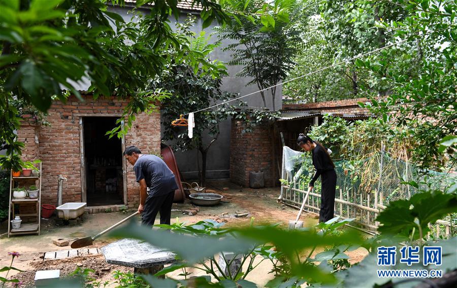8月5日,王曉楠與父親在自家庭院內勞作(無人機照片)。新華社記者郝源攝