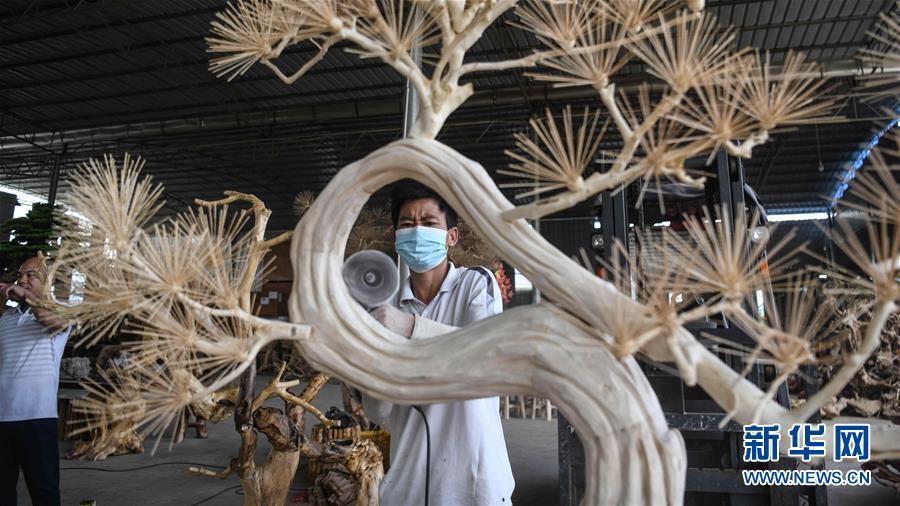 8月7日,工人在制作根雕工藝品。2017年以來,廣西桂林市永??h永安鄉(xiāng)通過幫扶返鄉(xiāng)青年創(chuàng)業(yè)的方式,建立起根雕工藝品就業(yè)扶貧車間,組織貧困群眾進(jìn)車間務(wù)工學(xué)藝,把當(dāng)?shù)刎S富的朽木和柑橘樹根枝資源利用起來,加工成盆景、茶桌、吊燈等根雕工藝品,不僅幫助貧困群眾在家門口掌握一技之長,還讓他們?cè)诿撠氄焙髮?shí)現(xiàn)穩(wěn)定增收。新華社記者張愛林?jǐn)z