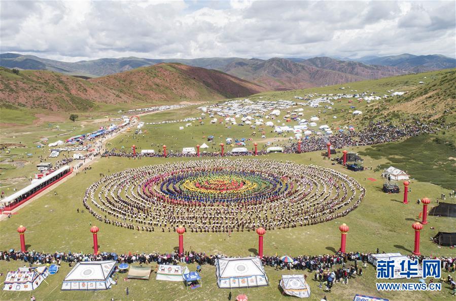 西藏首屆弦子舞展演現(xiàn)場(8月7日攝,無人機(jī)照片)。當(dāng)日,西藏首屆弦子舞展演在昌都市芒康縣舉行。眾多演員同臺(tái)獻(xiàn)藝,表演國家級(jí)非物質(zhì)文化遺產(chǎn)弦子舞,吸引西藏各地的群眾前來觀看。新華社記者孫非攝