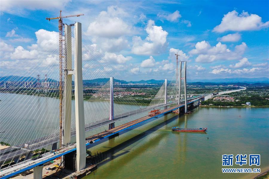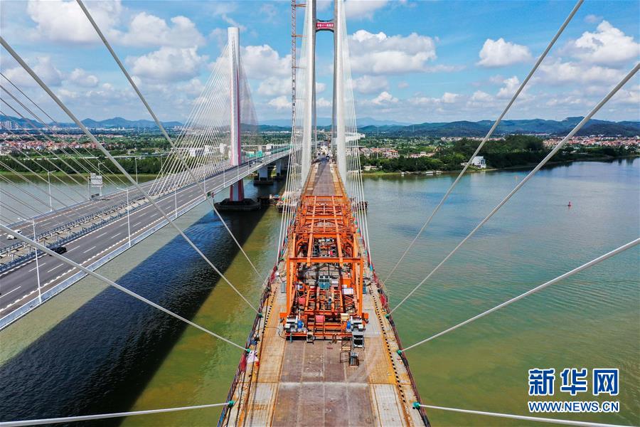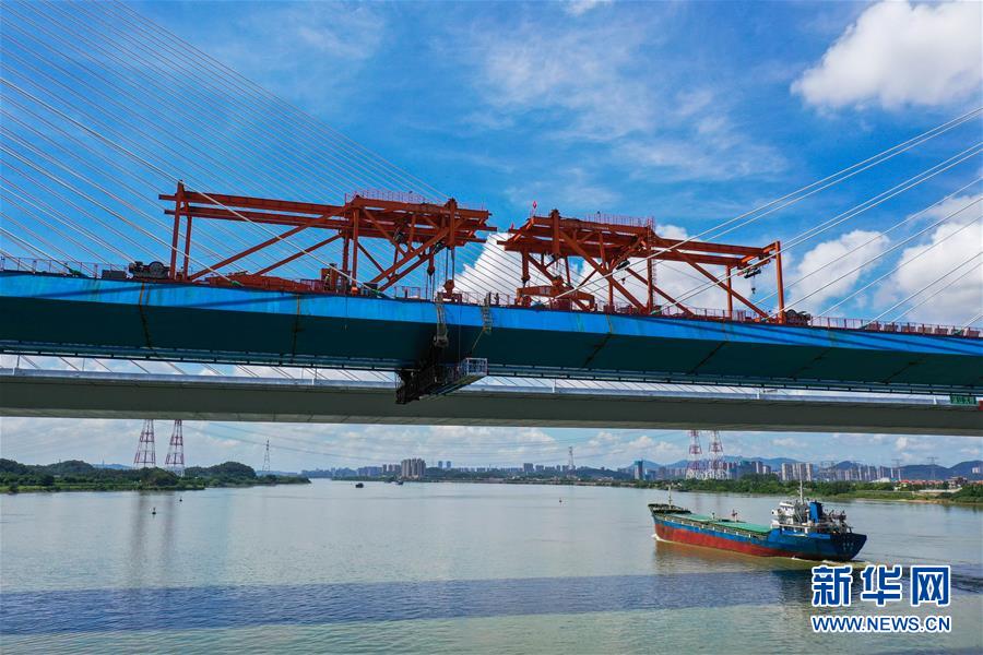 8月9日拍攝的廣州南沙港鐵路跨西江特大斜拉橋最后一塊鋼箱梁吊裝施工現(xiàn)場(無人機照片)。當日,中鐵十一局承建的粵港澳大灣區(qū)基礎(chǔ)設(shè)施“硬聯(lián)通”重點工程——廣州南沙港鐵路跨西江特大斜拉橋完成最后一塊鋼箱梁吊裝作業(yè),大橋即將合龍。該橋位于廣東佛山市和江門市交界處,全長1117.5米。新華社記者劉大偉攝。