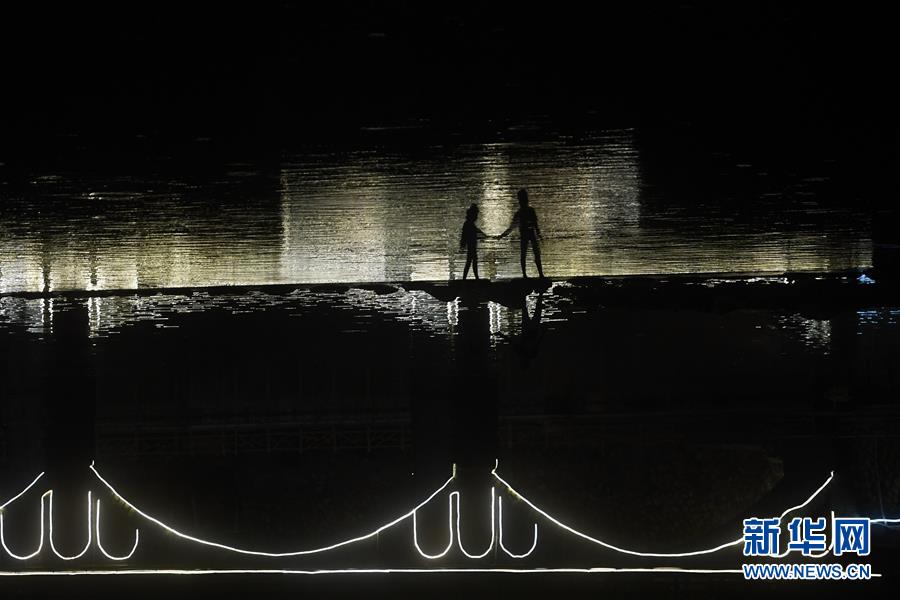 游客牽手從流經下姜村的小河橋上走過(2017年8月9日攝)。新華社記者黃宗治攝。