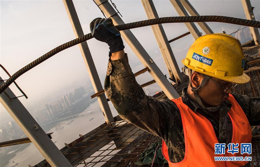 8月11日,工人在武漢綠地中心項目建設(shè)現(xiàn)場近500米的高空施工。新華社記者肖藝九攝
