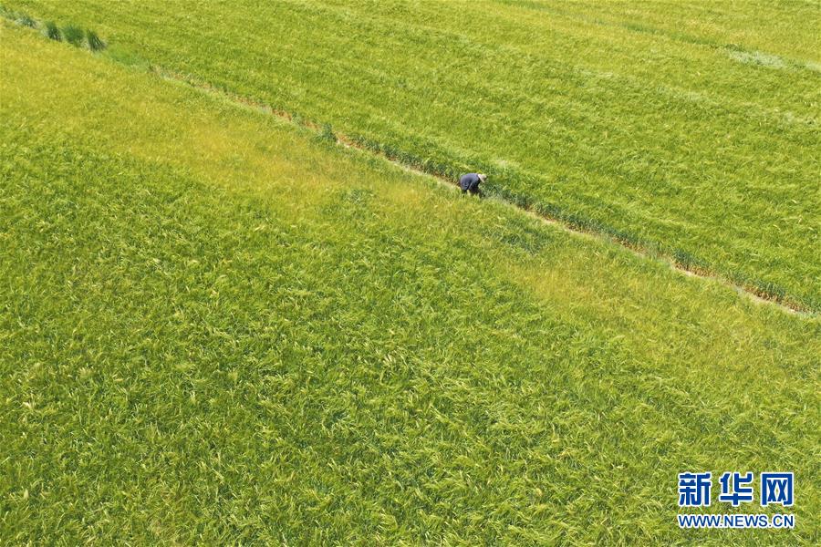 甘肅省金昌市永昌縣下四壩村村民徐文國在地里勞作(7月10日攝,無人機照片)。新華社記者 杜哲宇 攝