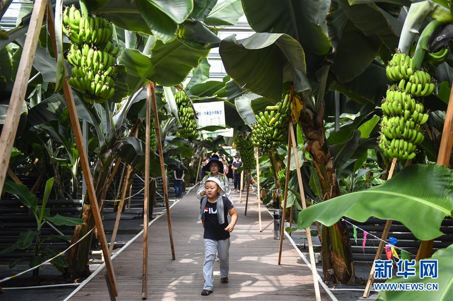 在吉林省永吉縣萬(wàn)昌鎮(zhèn)宇豐紅果木瓜產(chǎn)業(yè)園,游客與大棚內(nèi)的香蕉合影留念(8月12日攝)。新華社記者 許暢 攝