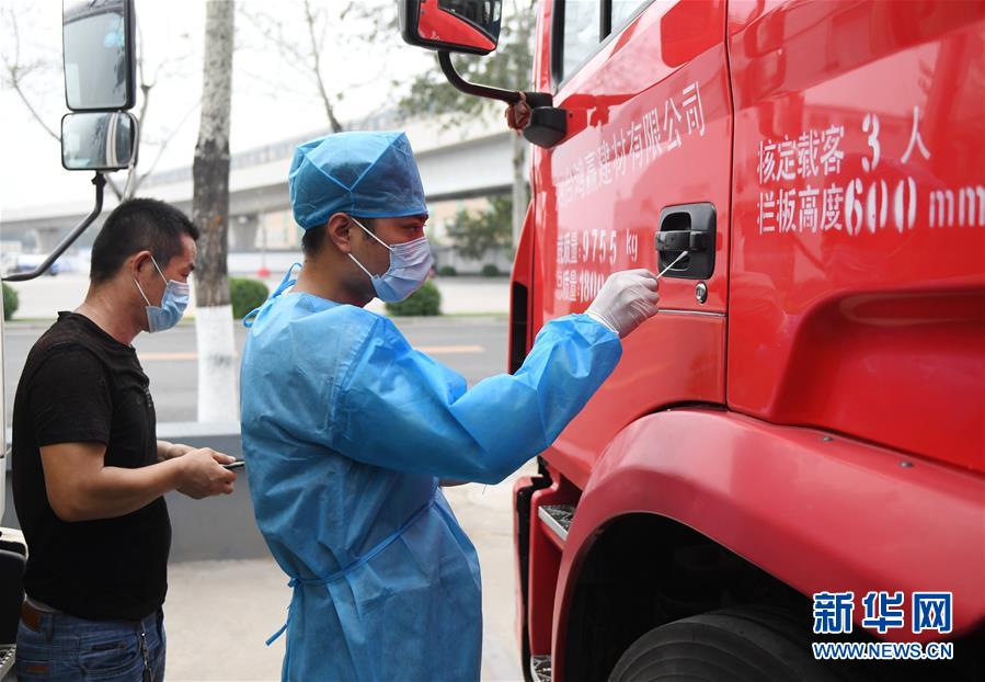 工作人員在新發(fā)地批發(fā)市場(chǎng)周轉(zhuǎn)新區(qū)對(duì)進(jìn)場(chǎng)車輛進(jìn)行取樣(8月6日攝)。 新華社記者 張晨霖 攝