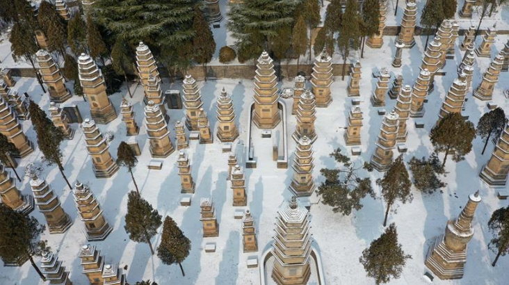 1月10日無人機拍攝的少林寺一景。當日,雪后初霽,河南登封少林寺分外秀美。