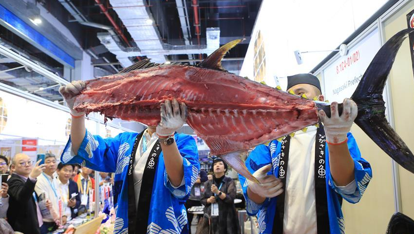 11月7日,來自日本長崎魚市株式會社的專業(yè)切魚師傅現場解體一條70公斤的藍鰭金槍魚,吸引大量參觀者觀看、品嘗。