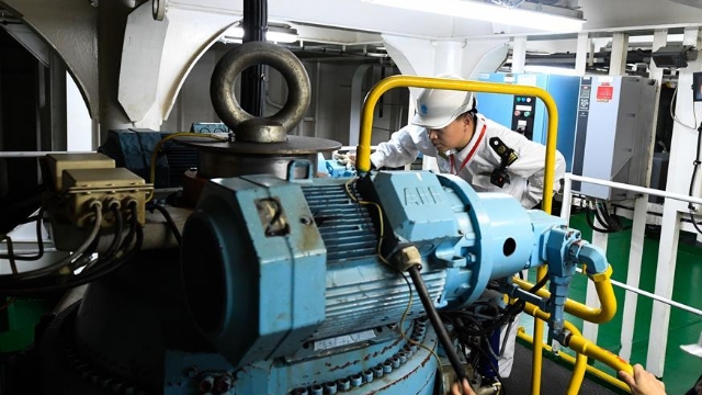 1月15日,海口海事局工作人員對??吭诤?谀细鄞a頭的粵海鐵4號客滾船進行春運前專項檢查。
