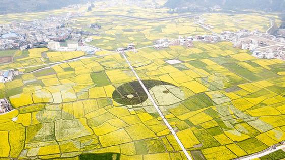 貴州黔南凱口鎮(zhèn),春暖花開(kāi),隨著氣溫逐漸升高,千畝油菜花田盛開(kāi),呈現(xiàn)出布依族青年男女圍繞太極圖的畫(huà)面。