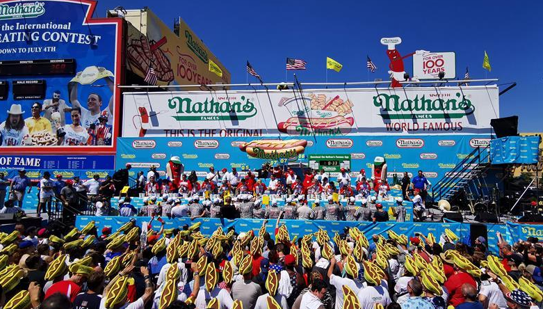 7月4日,在美國(guó)紐約康尼島,人們觀看吃熱狗大賽。在女子組比賽中,三木須藤10分鐘內(nèi)吃下31個(gè)熱狗,連續(xù)第六次贏得冠軍。