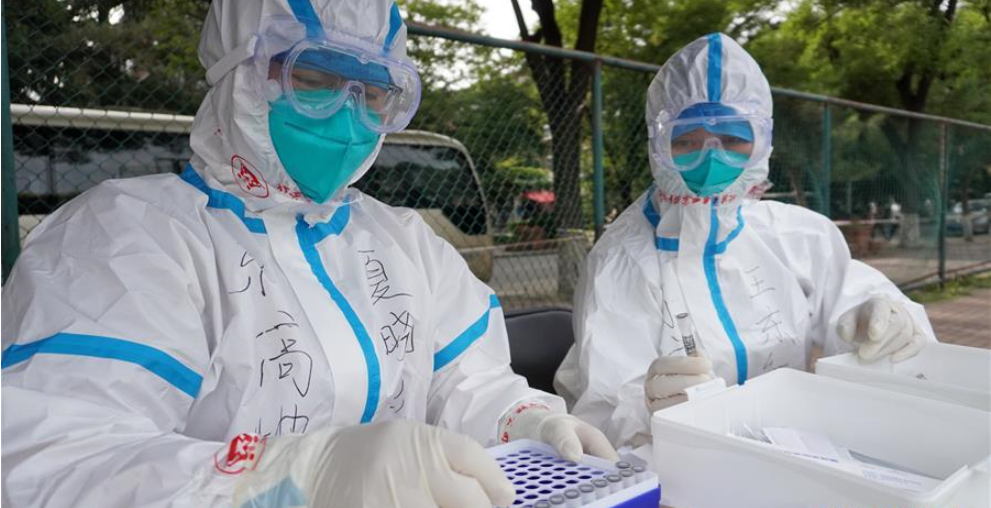 6月15日,北京市豐臺區(qū)東高地街道采樣點工作人員在進行采樣工作。