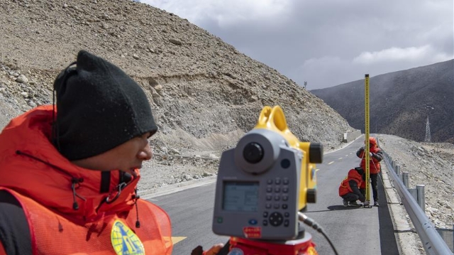 近日,國測一大隊隊員在日喀則市定日縣曲當(dāng)鄉(xiāng)境內(nèi)進行水準(zhǔn)測量。