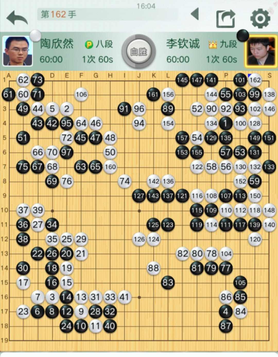 第三臺李欽誠九段VS陶欣然八段(對局棋譜)。陶欣然率先鳴金,贏下一局。領(lǐng)隊梁偉棠九段對這盤棋很贊賞,認(rèn)為陶欣然這盤棋下得非常漂亮,氣勢磅礴,有宇宙流再現(xiàn)的感覺。開局在左下角形成白棋取外勢,黑棋取實地的局面后,陶欣然將外勢發(fā)揮到淋漓盡致,在上面左右兩個角都繼續(xù)貫徹意圖,全力推進(jìn),形成了從上邊至中腹的巨大模樣,特別是在右下角一步五路尖沖,技驚四座,后來黑棋勉強(qiáng)進(jìn)來中腹破空,遭到陶欣然的全部殲滅。白棋僅162手,就取得了勝利!技驚四座那步棋是78手,猶如絕藝附身。