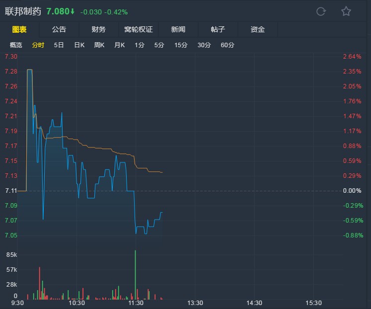 臨近上午收盤,聯邦制藥報7.08港元,跌0.42%。(文文)