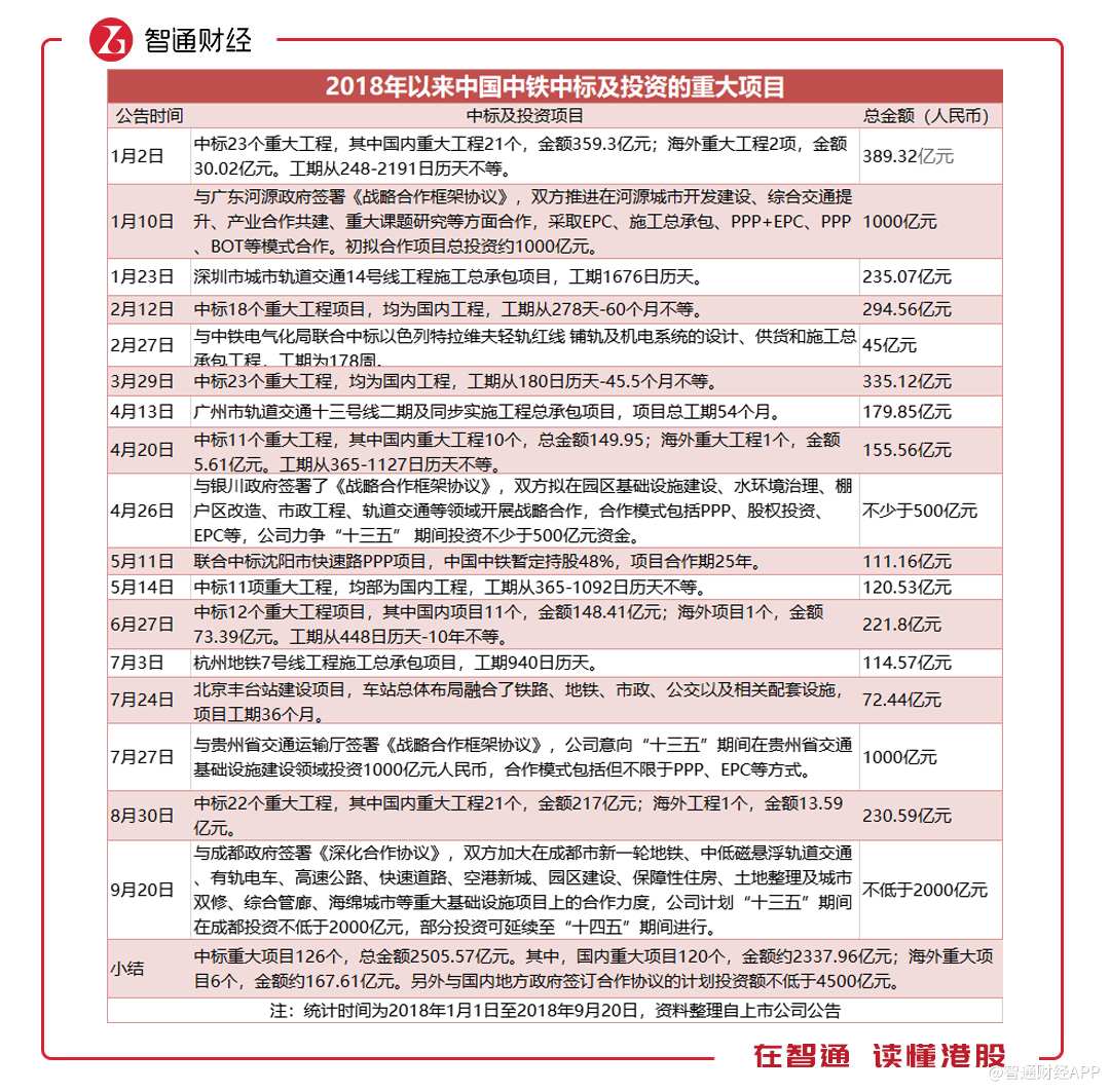 今年年初至9月底,中國中鐵共披露中標(biāo)的重大項目126個,項目總金額2505.57億元,超過去年全年所披露的重大項目金額。而這是在海外重大項目數(shù)量及金額明顯減少的情況下取得的,反映國內(nèi)的基建需求依然強勁。這些中標(biāo)的重大項目對中國中鐵來說也意味著未來可能釋放的巨大收入增長空間。