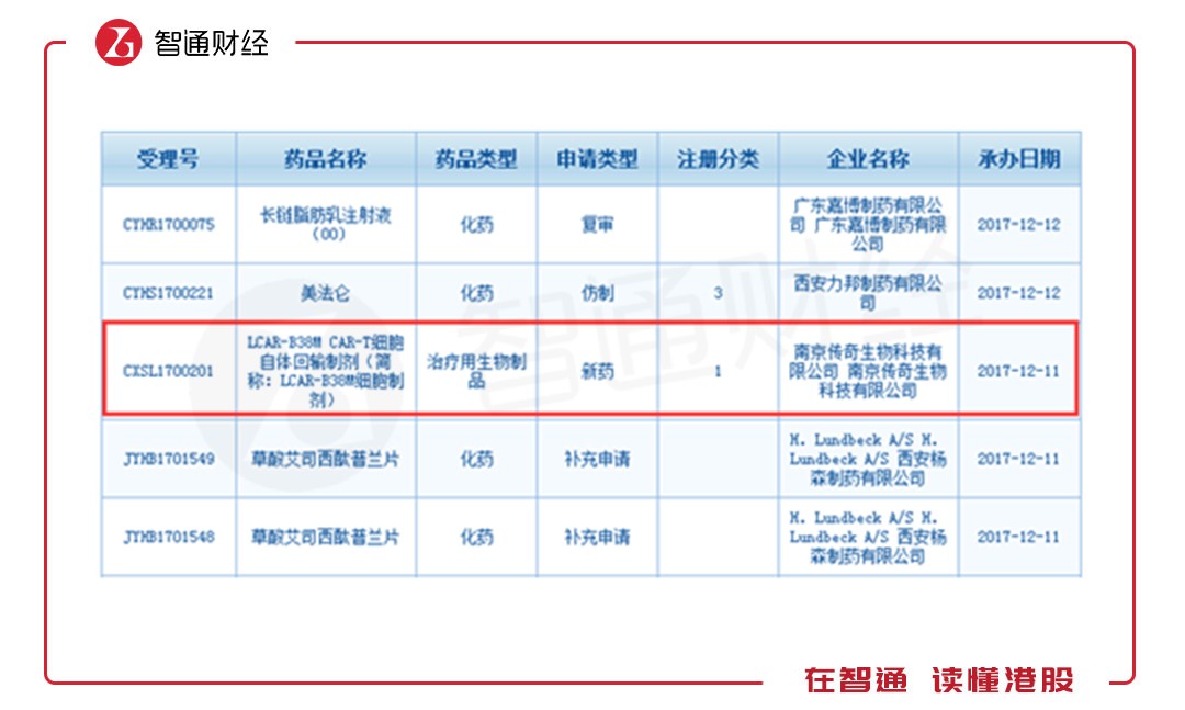 到2017年12月11日,傳奇生物提交CAR-T療法中國臨床申請(CXSL1700201)獲得CDE正式承辦受理,成為國內(nèi)首個獲得受理的CAR-T產(chǎn)品。同月18日,藥品評審中心公布第二十五批優(yōu)先審評審批名單,傳奇生物的LCAR-B38MCAR-T細胞自體回輸制劑獲準(zhǔn)進入。2018年3月12日獲CFDA臨床審批完畢。